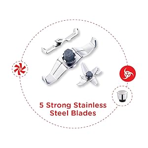 5 hardened stainless steel blades for multiple functions 1.5 Litre liquidizing jar, 1 Litre wet/dry grinding jar, 0.4 Litre chutney jar, 1.5 Litre flexi jar Warranty: 2 years on product Power: 750 watts; Operating voltage: 230 volts
